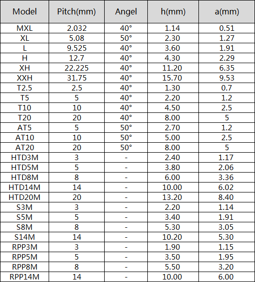 Número do modelo | MXL, XL, L, H, XH, XXH, T2.5, T5, T10, T20, AT5, AT10, AT20, HTD3M, HTD5M, HTD8M, |